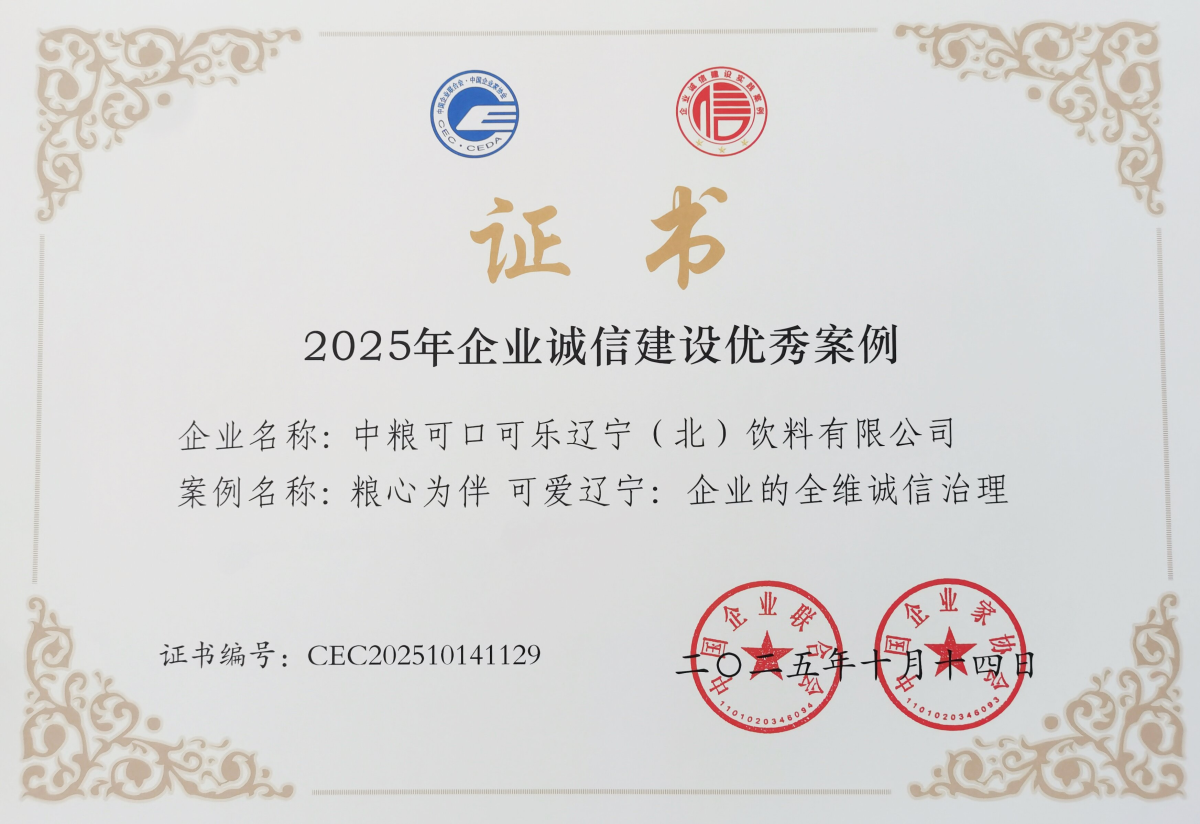 “粮”心为伴,“可”爱辽宁:中粮可口可乐全维诚信治理获“2025年企业诚信建设优秀案例奖”