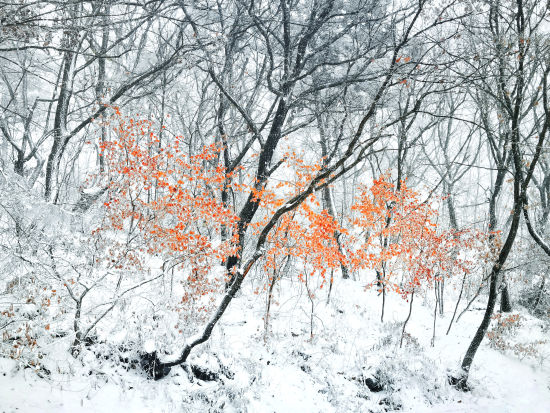 创作思路上,选取雪覆山林中仍存的橙红枝叶为视觉焦点,利用黑白灰的雪景基调衬托暖色叶片,营造冷暖对比。通过捕捉树木在风雪中的姿态,展现自然在季节更迭里的沧桑与柔美,借“风霜雪月”的意象,传递对时光流逝中生命张力的思考,让观者于清冷雪景中感知那份倔强的绚烂。
