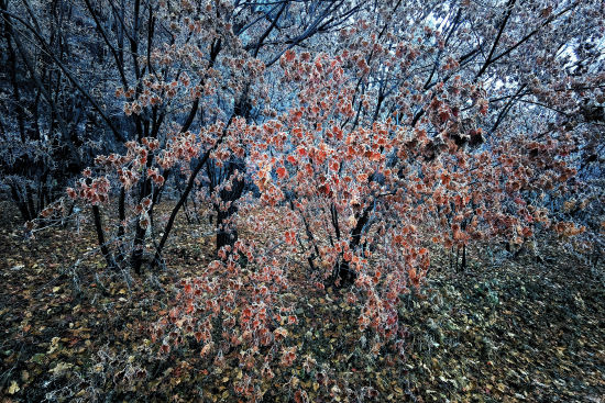 简介:作者意在展现寒秋霜枫的坚韧诗意,借霜覆红叶与冷调树林的交融,诠释秋末生命的独特美感。