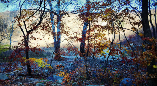 简介:作者以五彩枫林、碎石林地与远山的融合,展现秋末自然的斑斓与静谧张力。