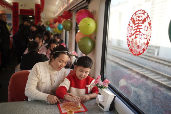 趣味互动与安全科普并行,让旅途安心亦有趣。活动围绕铁路乘车常识与反诈知识设置两轮有奖问答,内容涵盖12306购票流程、儿童票新规、电信诈骗防范等实用话题。旅客踊跃参与,答对者均获赠列车准备的精美纪念品。乘警结合题目现场剖析诈骗手法与出行隐患,助力旅客筑牢安全意识。列车还为小朋友准备了非遗剪纸和拓印福字体验,孩子们在动手创作中感受传统年味,一幅幅红艳剪纸、一张张饱满“福”字,点亮了车厢,也传递出新春的美好祝愿。