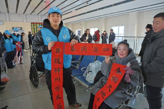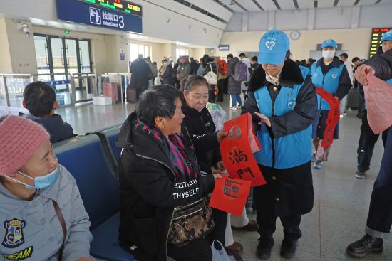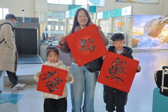 “没想到在赶车的路上还能收到手写的福字,太惊喜了!这比买的印刷品更有意义,真正感觉把铁路的祝福直接带回家了。”正准备乘车回家山东老家的张女士拿着墨迹未干的对联,高兴的向工作人员展示。