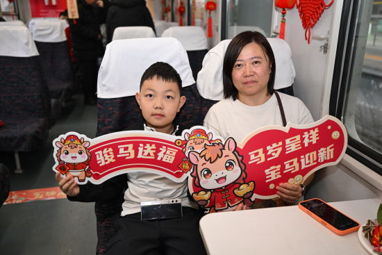 一上车,年就到了。“我们一踏上列车就感受到了浓浓的年味,糖瓜、瓜子摆满了餐桌,列车工作人员通过唱歌、猜灯谜、送福字等互动形式让我们感受到年离我们近了,家也更近了。”乘客宋女士笑着说道,言语间满是归乡的喜悦。