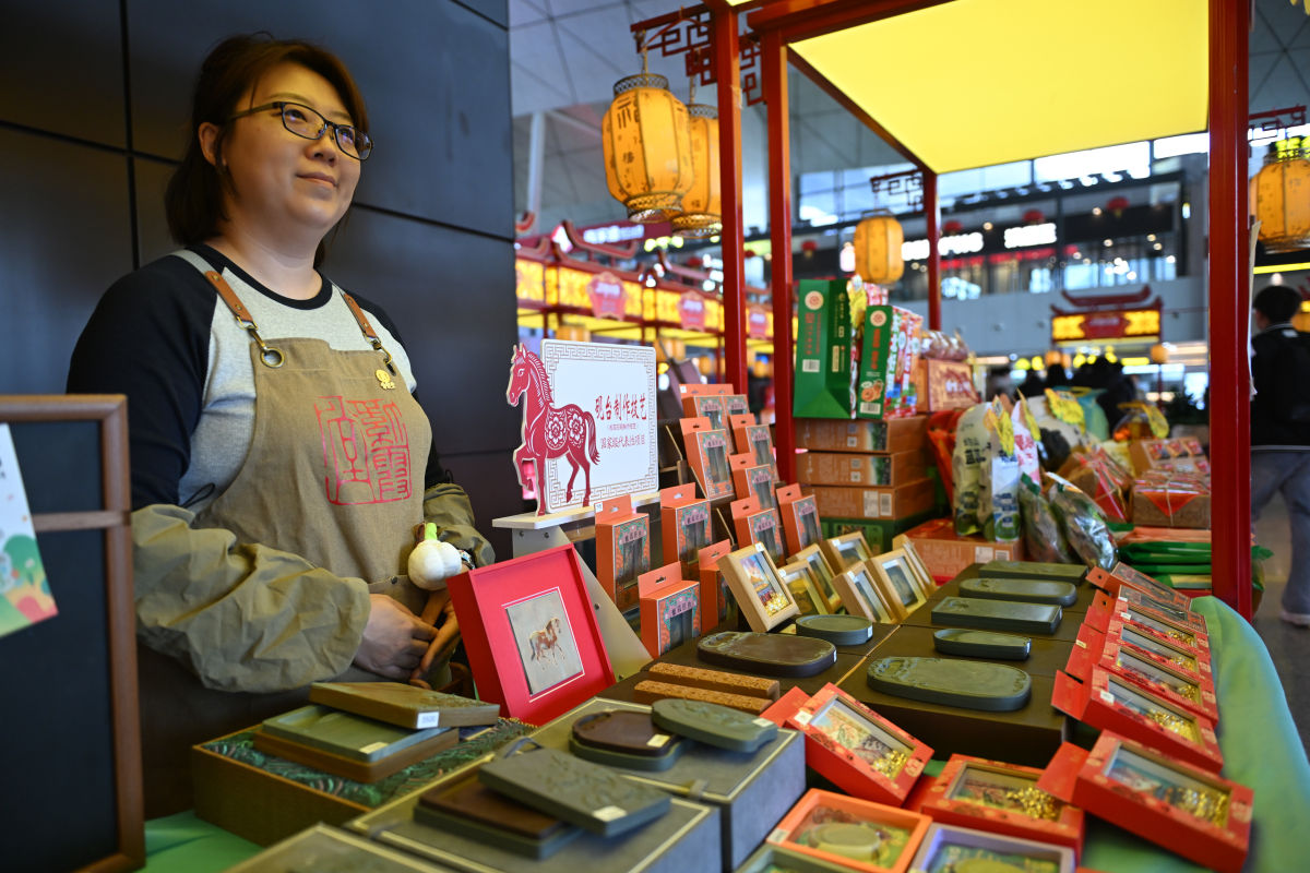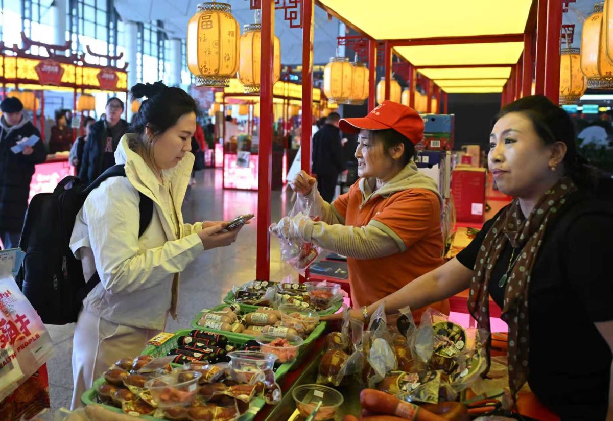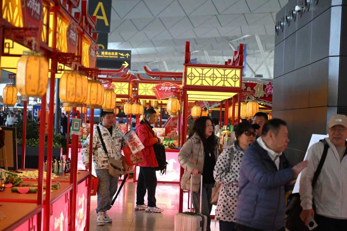 3月16日,旅客在步履匆匆间在沈阳桃仙国际机场近距离感受本溪文旅风采。3月14日,“万市大集”本溪文旅市集在沈阳桃仙国际机场正式亮相。本次活动由辽宁本溪市文化旅游和广播电视局、商务局联合举办,汇聚本溪市大石药业、紫霞堂、小市一庄、五女山米兰酒业、抗联食品近20余家企业、百余种特色旅游商品与文创产品,集中展示非遗技艺、地域特产全面呈现本溪文旅产业发展成果,让旅客在步履匆匆间近距离感受本溪文旅风采。