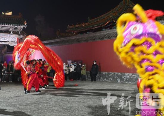 2022年12月31日晚,“喜迎2023·沈阳古城过大年”主题活动启动。图为在沈阳故宫博物院门前广场举行的龙狮表演。 中新社记者 于海洋 摄 2022年12月31日晚,“喜迎2023·沈阳古城过大年”主题活动启动。图为在沈阳故宫博物院门前广场举行的龙狮表演。 中新社记者 于海洋 摄