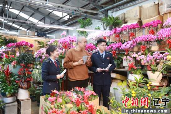 近日,国家税务总局大连市税务局青年税务干部走进大连市香炉礁家具市场花卉厅,开展“税宣进花市 税惠到万家”主题宣传活动,讲解税收优惠政策,与纳税人、缴费人一起迎春纳福。张桐/摄