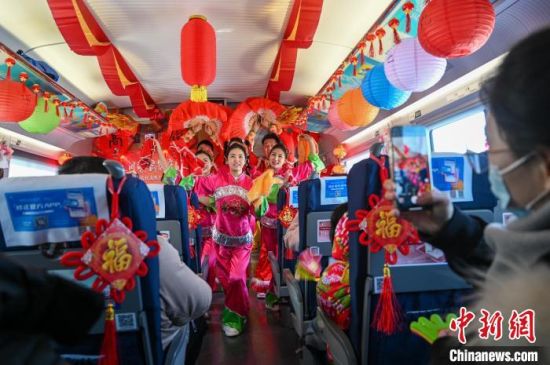 2月23日,在传统元宵佳节即将到来之际,由中国铁路沈阳局集团有限公司沈阳客运段担当的沈阳北开往长白山的G8039次列车上热闹非凡,一场以“春来人间暖 高铁庆团圆”为主题的高铁元宵灯会正在上演,吃元宵、猜灯谜、看节目,引来观众阵阵喝彩声。