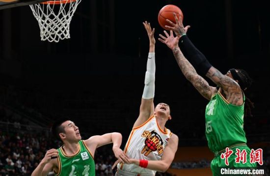 图为深圳马可波罗队球员沈梓捷(中)在比赛中拼抢。中新网记者 于海洋 摄