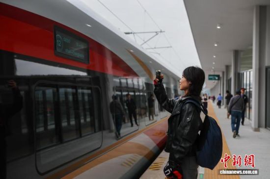 图为旅客在辽宁抚顺站G8167次抚顺至长白山列车前拍照。中新社记者 于海洋 摄