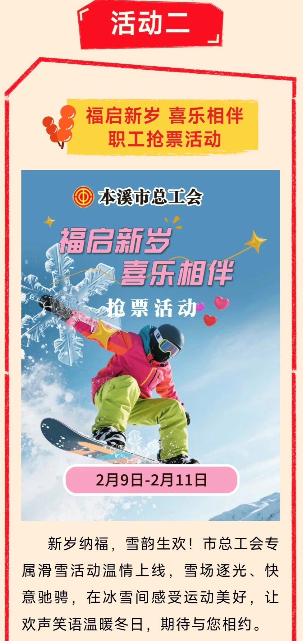 活动率先以冰雪运动为切入点,点燃职工冬日热情。自2月2日起,市总工会通过官方服务平台“溪工惠”的活动集锦板块,分阶段向会员发放戏雪票与滑雪票。其中,2月2日至8日可参与赢取戏雪套票;2月9日至11日,每天中午12点准时开放滑雪票抢票通道。