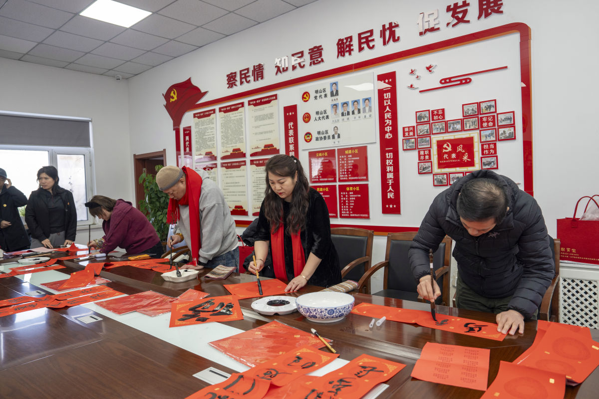 活动的第四站来到了明山区明山街道民建社区。这里曾是本溪市总工会“三位一体”社区工会阵地建设的试点之一。在社区活动室,闻讯而来的居民们围在案台前,挑选心仪的联句,书法家们有求必应,现场气氛热烈祥和。除了送春联,社区志愿者服务队也积极参与活动组织。据悉,该社区依托工会支持的阵地,组建了由劳模、党员带头的志愿者服务队,长期为居民提供各类便民服务,形成了“人人为我,我为人人”的和谐社区氛围。工会的关怀通过社区阵地,更深、更实地传递到了职工家门口。