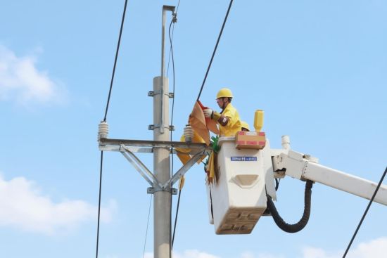 国网沈阳供电公司工作人员在康平县方家镇10千伏小陵线开展带电作业,消除分布式风电用户的用电故障隐患。(张怡飞)